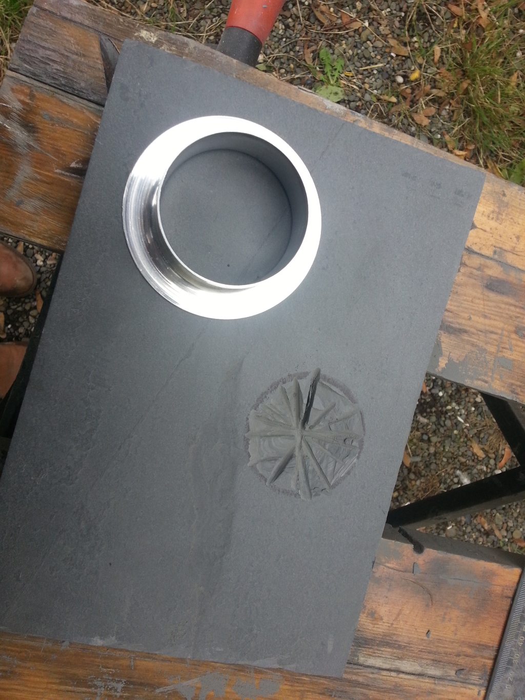 The next problem is cutting the circle in the central tile for the flange (the circle is off-centre because I widened the channel – it won’t be noticeable behind the stove). I experimented with the grinder but I wasn’t really expecting it to work so I took it to Dad and he drilled it out for me (which went a lot faster after I went to Ken Quines and bought a glass drill bit).